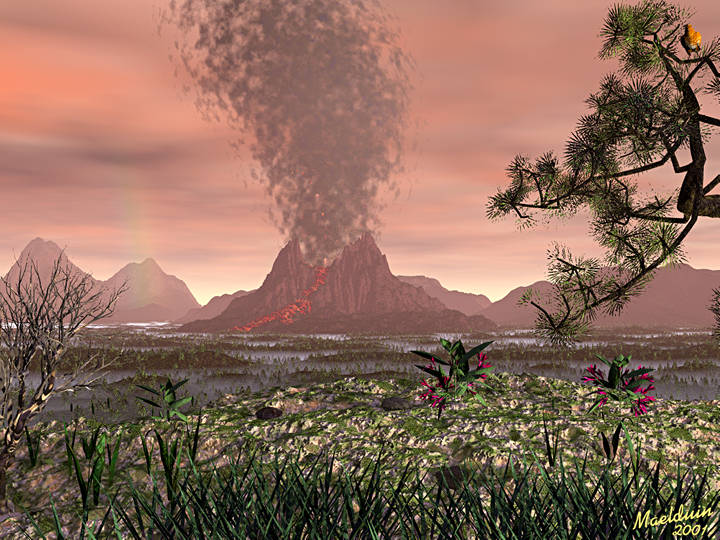 DawnThis still represents the dawn atmosphere. It coud be somewhere in Eastafrica of today or it coud be million years away in the past.Bryce 4, PlantStudio 1.6Volcano, lava and forest are modeled with the Bryce terrain editor. The tree at right and the bush at left are part of the Bryce 4 content CD, the rest of the vegetation is made with the fantastic tool "PlantStudio 1.6". |
