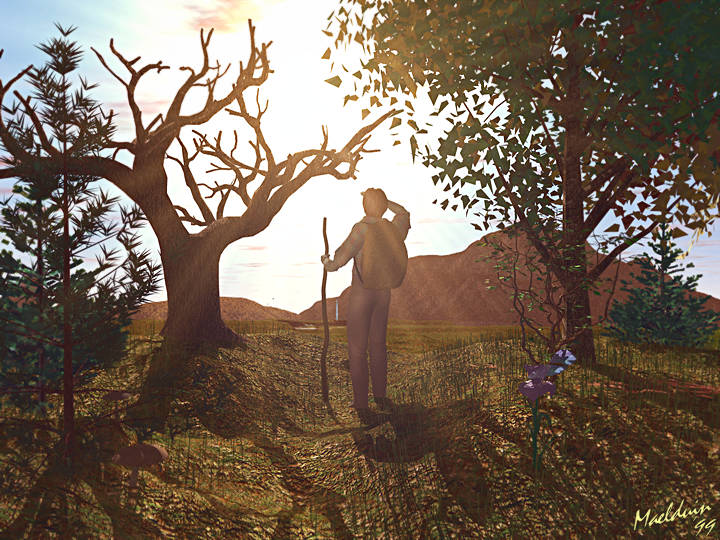 TravellerAutumn is my favorite season and hiking my favorite hobby in this time. So this one is a tribute to the golden time of the year.Cinema4D - Bryce 3D - Poser3The foreground with the traveller and all plants is modeled and rendered in Cinema4D. In the C4D scene I placed a background picture made with Bryce 3D. To have equal colors in the C4D terrain as in the background, I used a birdeye view picture from the Bryce terrain as texture for the C4D terrain. |