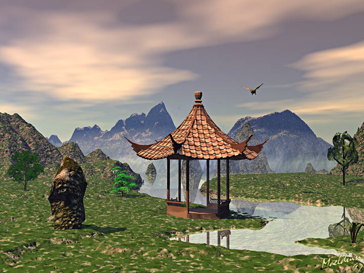 |  | Zen parkThe picturesque landscape in Setchuan/China was the inspiration to this scene.Bryce 2 - Bryce 4The original image I made in 1997 with Bryce 2. Now for the gallery I made some changes with Bryce 4: I tuned the material of foreground terrain and the sky. | 10. 1997 |